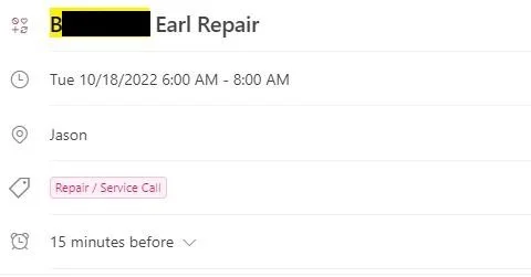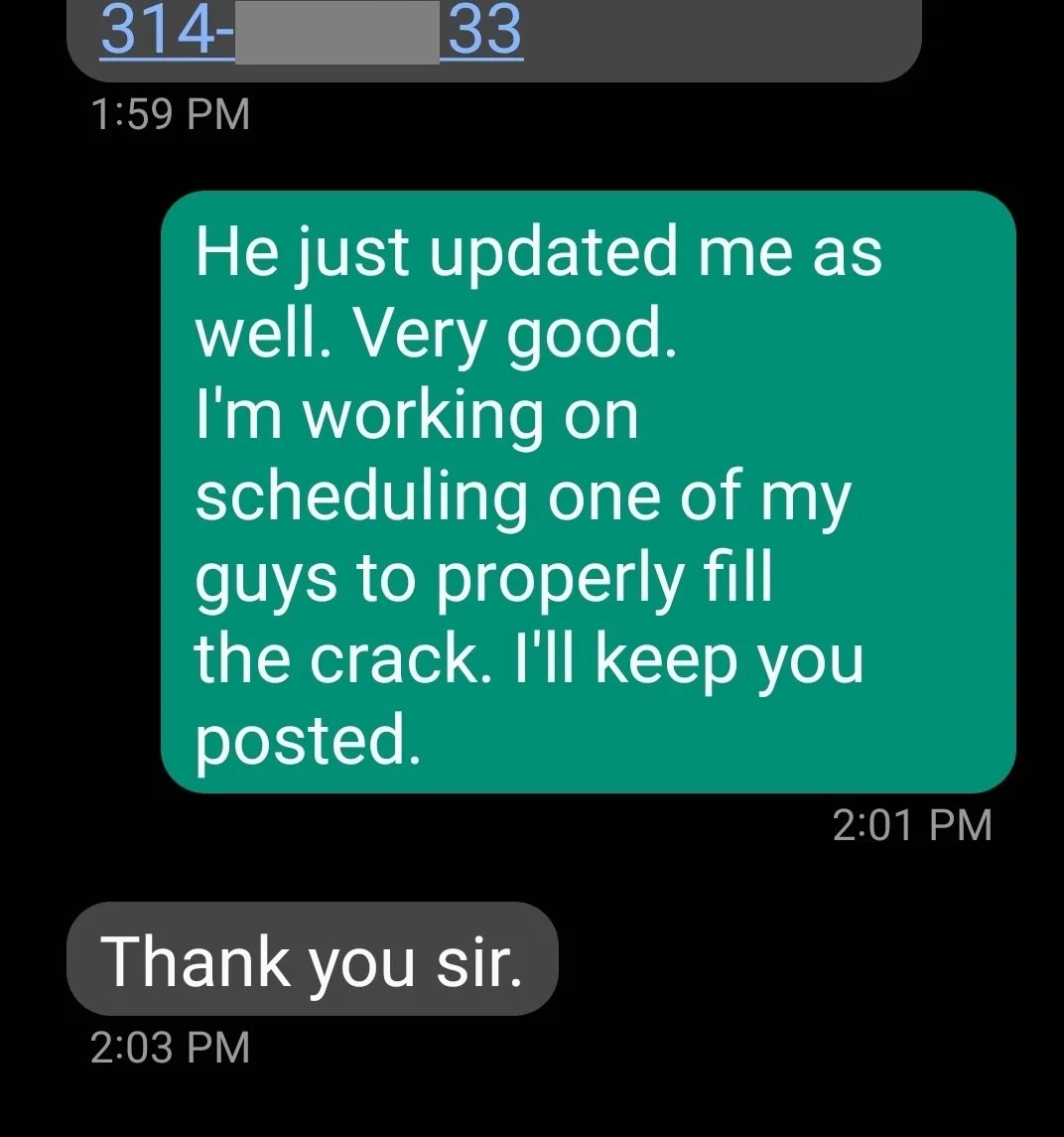 Below is a screenshot of our scheduled Service Call to fill the crack (No Charge) with a penetrating epoxy.