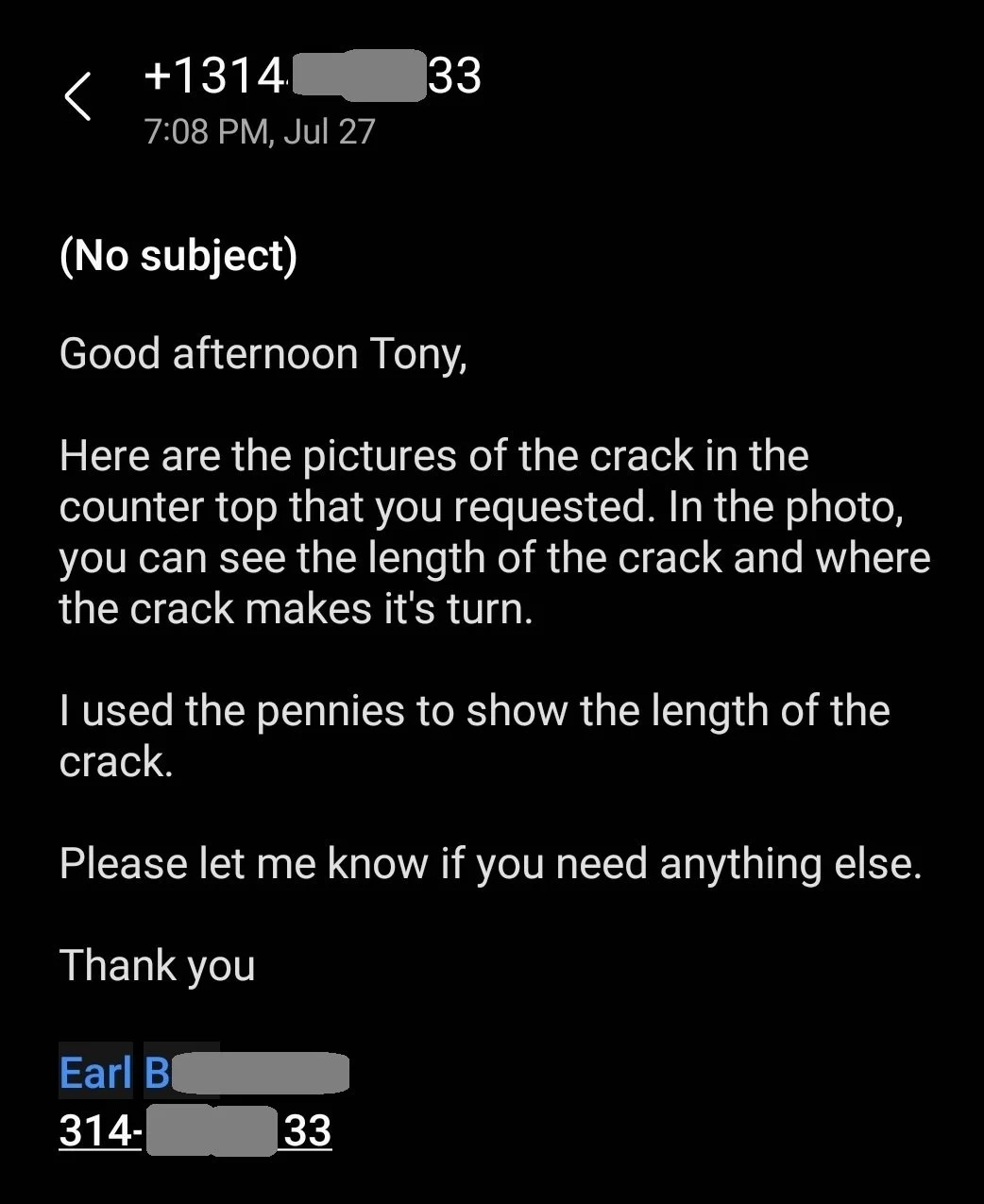Below is my confirmation with the client that the Rep had updated us on his finding…the crack was not generated from issues related to the installation or the material. It had the appearances of a stress related crack (Keeping in mind that the countertops were install 4 1/2 years prior and the crack had just recently appeared).
