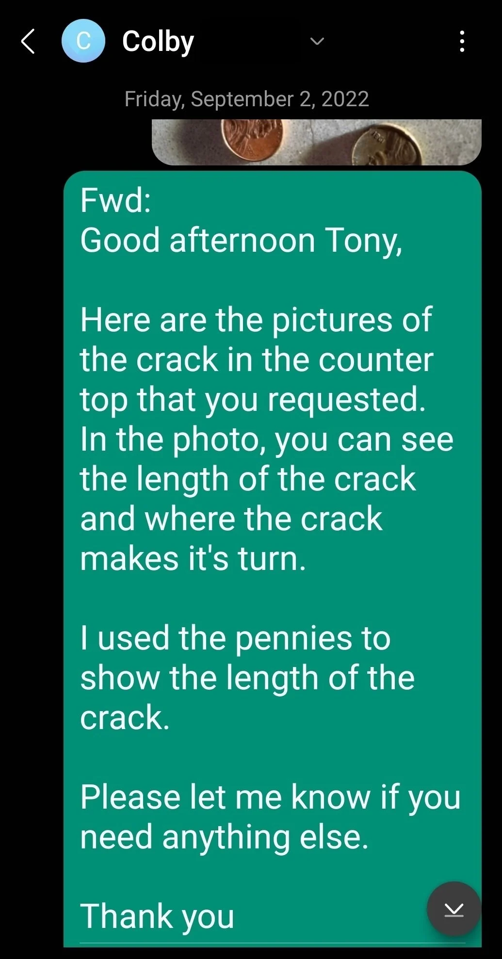 Below is confirmation from the client that the Caesarstone Rep had made contact and scheduled an appointment to assess the issue